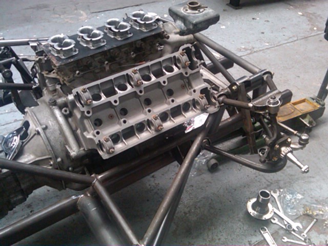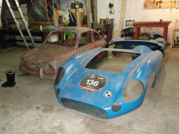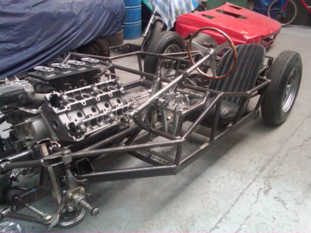 There is another one under construction that will have a Fiberglass Body and the Engine is a V8 Maserati. Frame is tubolar like you see on the Black one. Doors and hood are aluminium. Color can be changed, all the drivers area is also aluminium. Customer wishes can be installed if needed. So far it is planned to have it with a 4.9L V8 Maserati Engine and 5 Speed Gearbox. Color will be dark Red ( the old Maserati Red ). Sitting on Borrani Wheels, Alu Tank, Alu Oil Tank, Correct Steering wheel, correct gauges,... Will be a very nice car and a chance to get one of these 450s to a better price.